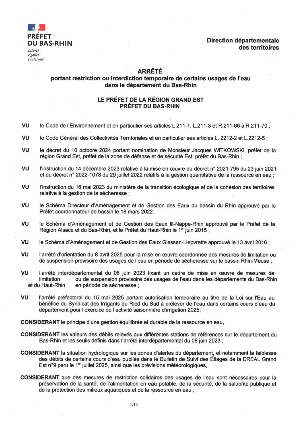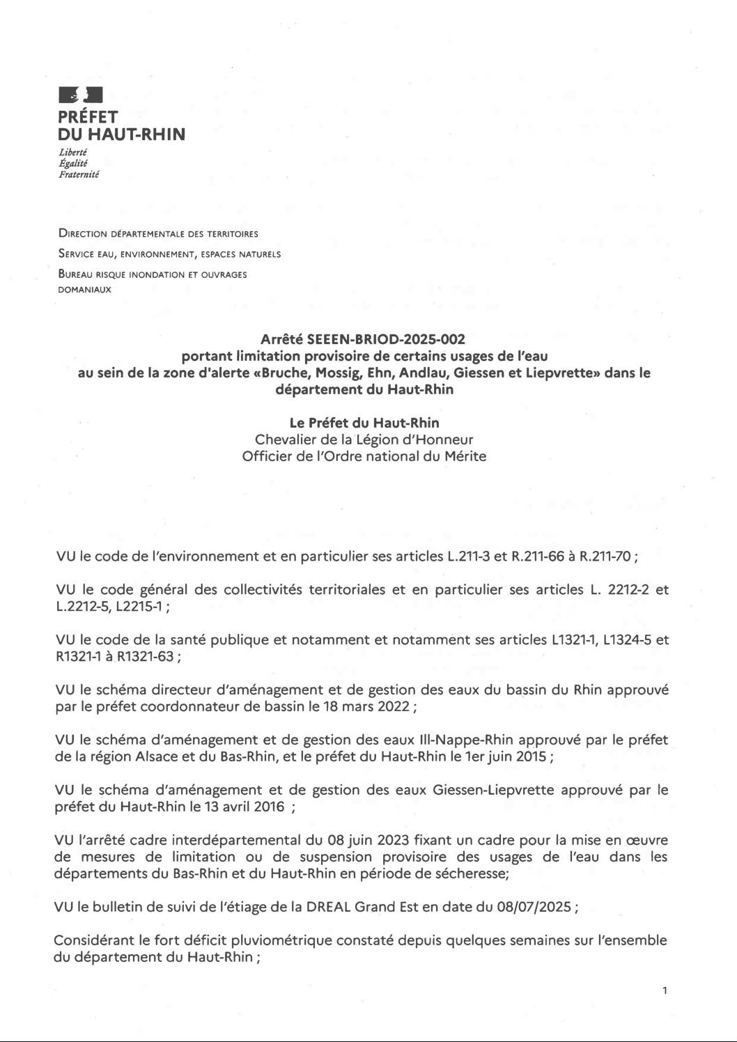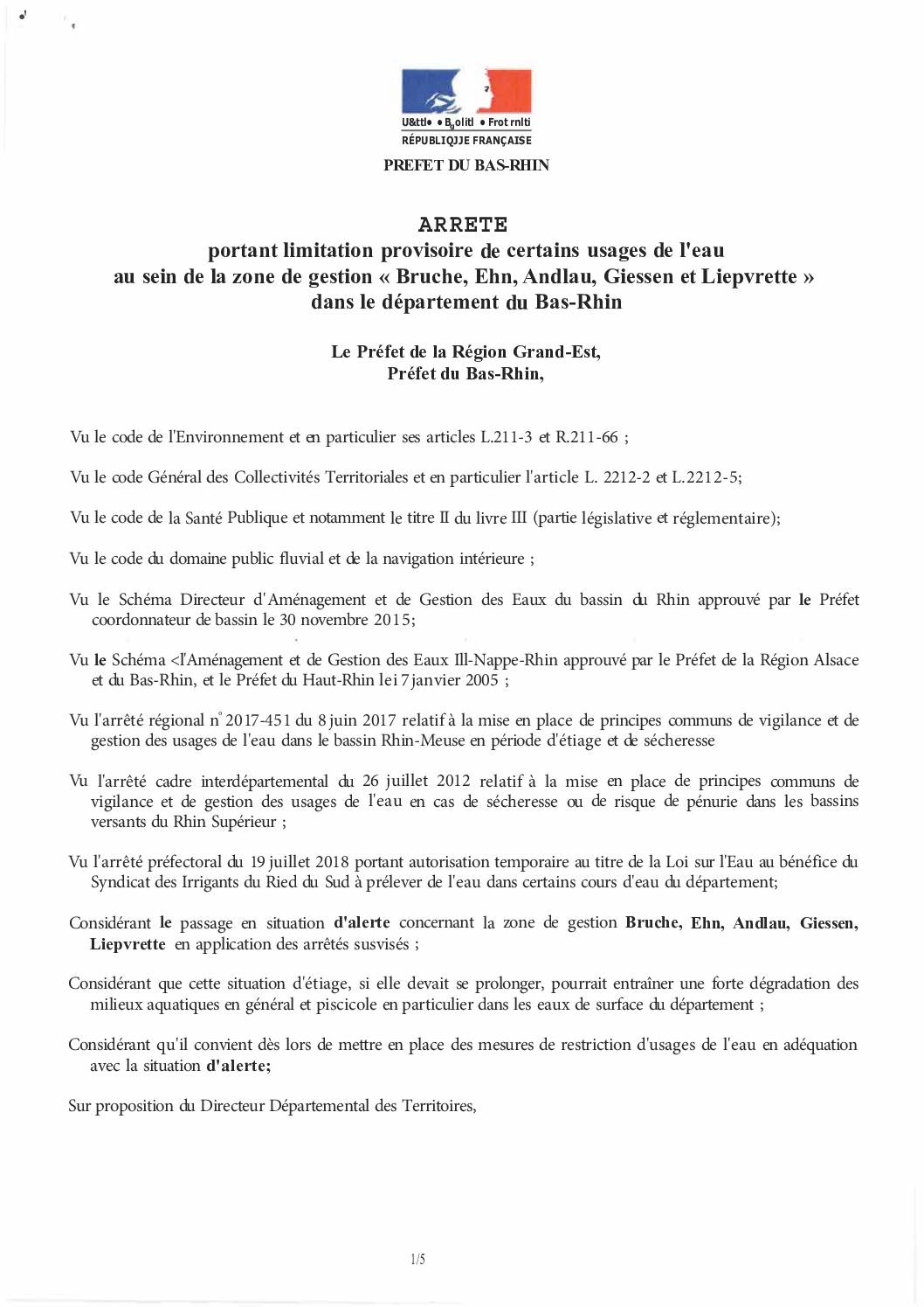 Arrêté préfectoral – Restriction ou interdiction temporaire de certains usages de l’eau dans le département du Bas-Rhin 02/07/2025