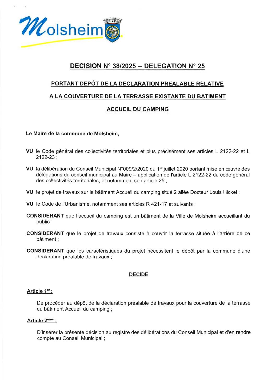DÉCISION 38/2025 – DÉLÉGATION N”25 PORTANT DÉPÔT DÉCLARATION PRÉALABLE COUVERTURE TERRASSE CAMPING 14/05/2025