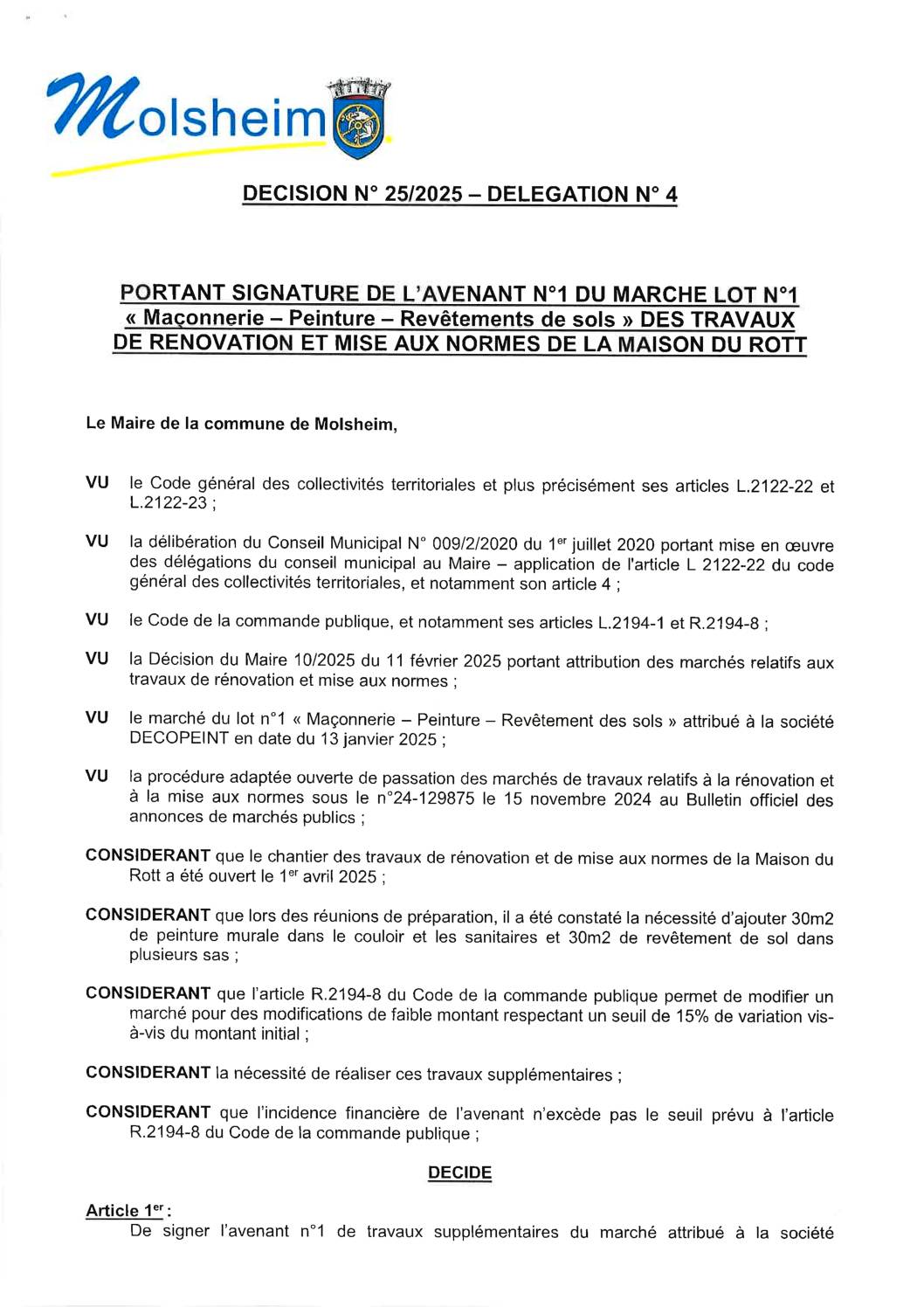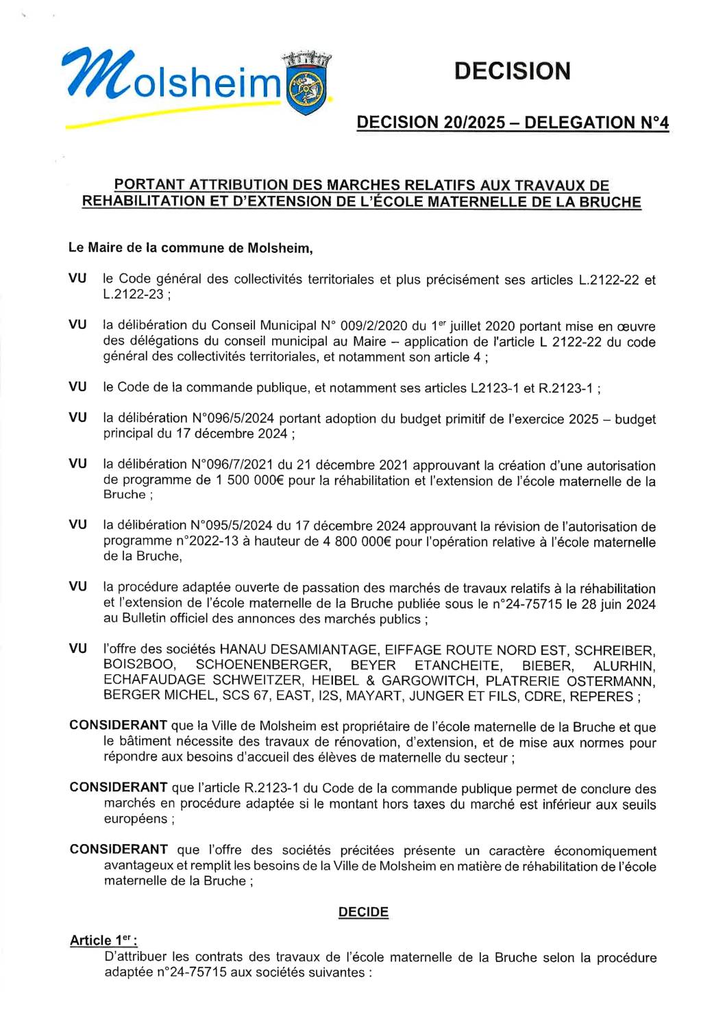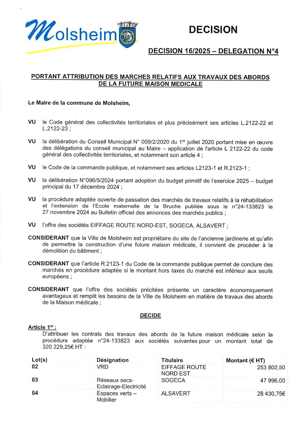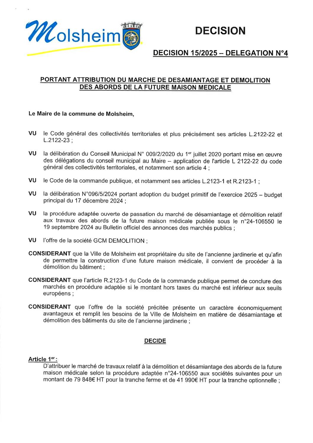 DÉCISION 15/2025 – DÉLÉGATION N”4 PORTANT ATTRIBUTION DES MARCHÉS DÉSAMIANTAGE ET DÉMOLITION 17/02/2025