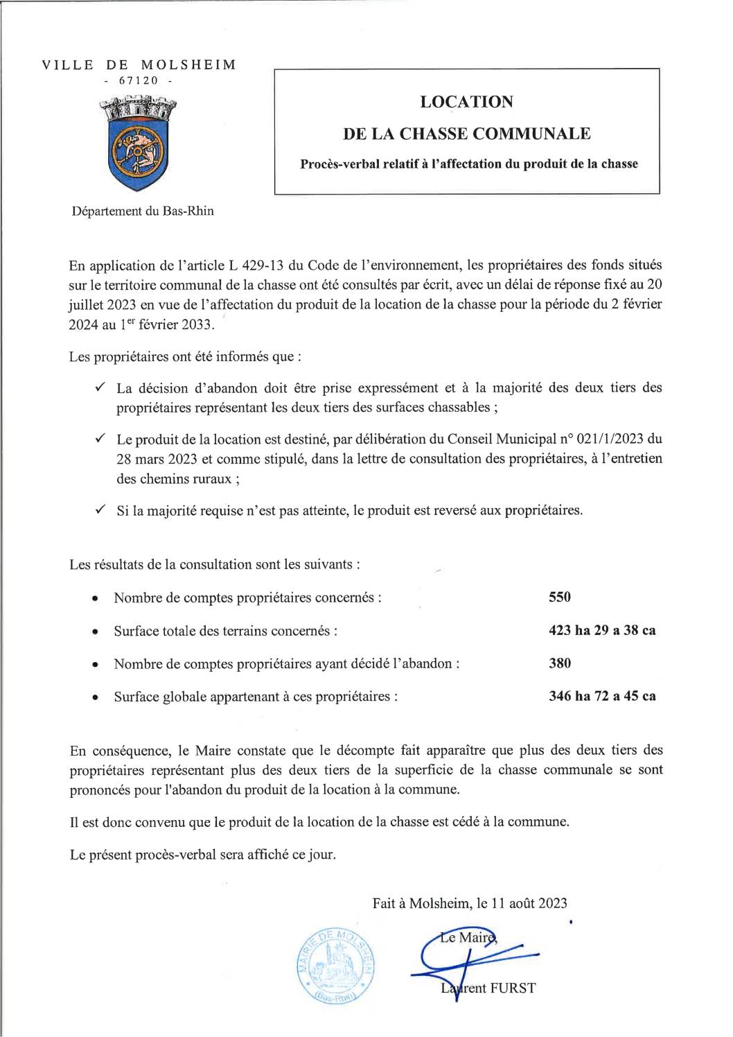 En application de l’article L 429-13 du Code de l’environnement, les propriétaires des fonds situés sur le territoire communal de la chasse ont été consultés par écrit, avec un délai de réponse fixé au 20 juillet 2023 en vue de l’affectation du produit de la location de la chasse pour la période du 2 février 2024 au 1ᵉʳ février 2033.