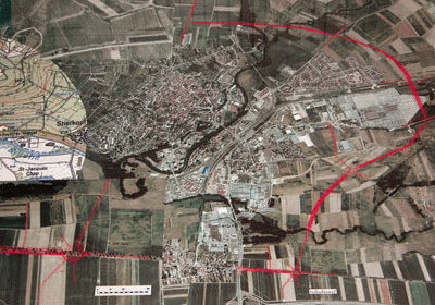 En rouge, le tracé du contournement sur une photographie aérienne du ban communal de Molsheim.